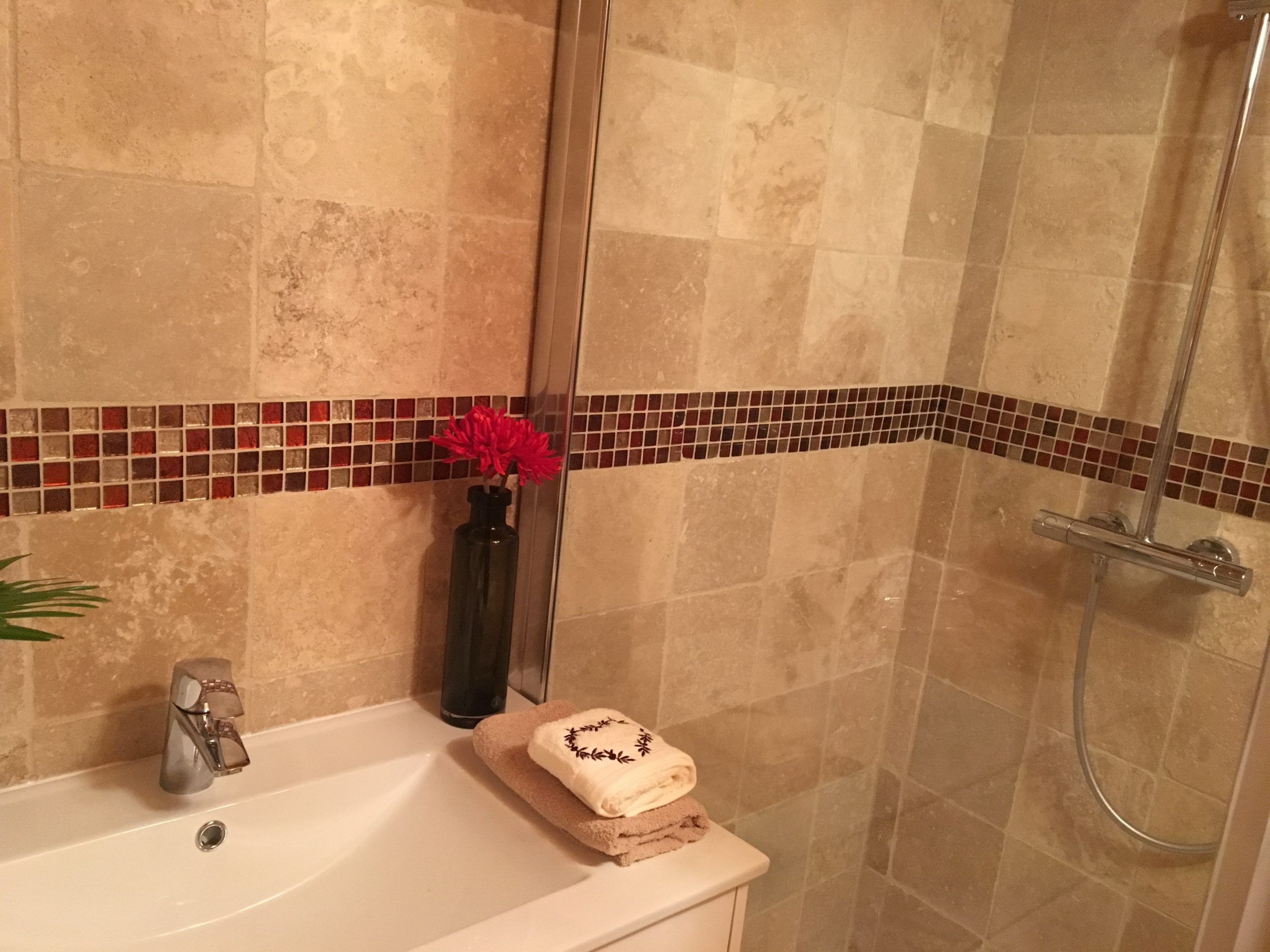 Salle de bain : rénovation, remplacement de la baignoire par une douche, changement du meuble robinetterie et de la faïence. Nous avons ainsi gagné en place et en ergonomie.